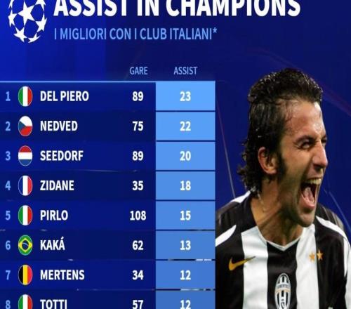 意甲球員歐冠歷史助攻榜:皮耶羅、內德維德、西多夫前三