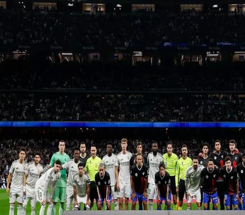 在伯納烏球場的馬德里德比開始前,皇家馬德里和馬德里競技的球員以及裁判團隊與一幅標語牌合影,以支持當天開展...