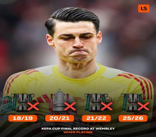 2026年英聯杯決賽,阿森納0-2不敵曼城,至此,阿森納門將凱帕在溫布利4次出戰杯賽決賽全部失利。此役在溫布利球場...